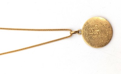 MÉDAILLE DE BAPTÊME en or (750) représentant la Vierge de trois-quarts. Signée. Le revers chiffré "JBC" et daté "23 août 1955". Orfèvre : Louis MULLER (1902-1957).