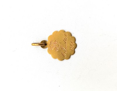 PETITE MÉDAILLE de baptême en or (750) à bords polylobés gravée de vaguelettes et centrée d'une tête d'angelot (accidentée) en émail cloisonné. Le revers et gravé "6 juillet 1900"