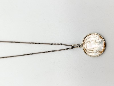 PENDENTIF en or gris (750) serti d'une médaille en nacre ciselée au profil de la Vierge.
