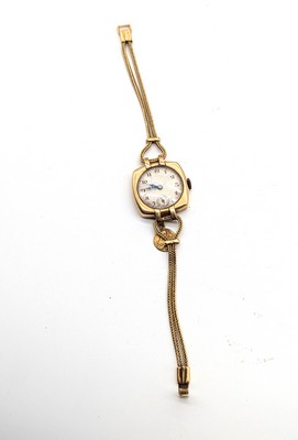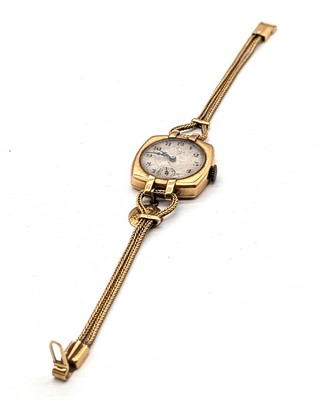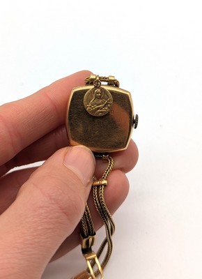 MONTRE en or jaune (750) à boîtier carré et cadran gris à chiffres arabes avec compteur des secondes à 6h. Signé et numéroté 872248 au revers. Bracelet souple en or (750) à mailles tressée ornée d'une médaille représentant Sainte Thérèse de Lisieux.