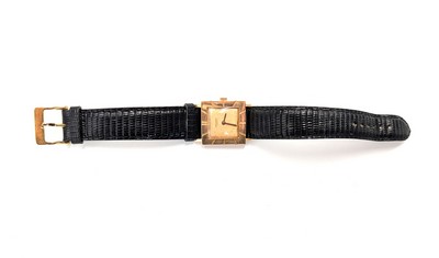 MONTRE bracelet de dame à boîtier carré en or (750) cannelé. Mouvement mécanique, cadran doré.