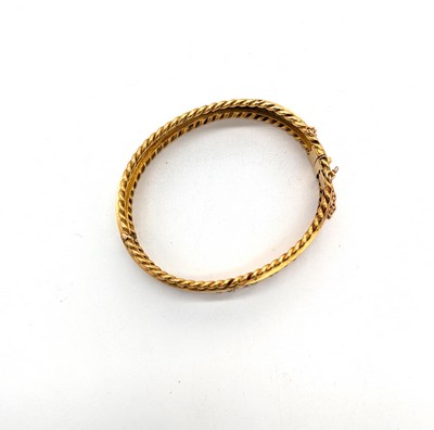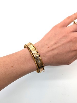 BRACELET MANCHETTE rigide en or (750) à bordures torsadées gravées de motifs floraux rehaussées de petites perles.