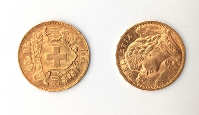 2 pièces de 20 F or, 1900 et 1901.