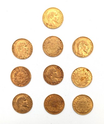 10 pièces de 20 F or, tête nue, Paris, 1852 à 1857.