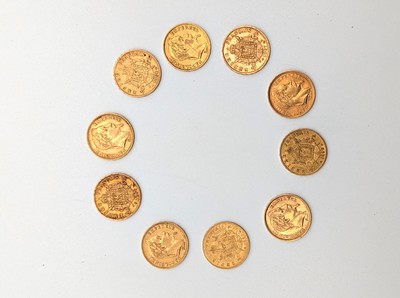 10 pièces de 20 F or, tête laurée, Paris 1863 à 1867 (6) et Strasbourg 1866, 1867 (2) et 1868.