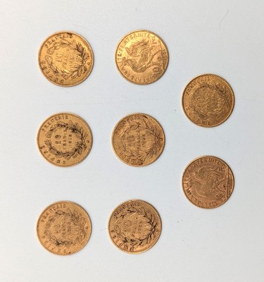 8 pièces de 10 F or, Napoléon III tête nue Paris 1857, 1858 et 1860, tête laurée Paris, 1862, 1864, 1866 et au coq 1901 et 1911.