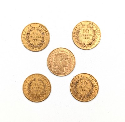 5 pièces de 10 F or 1864 (Napoléon Tête Laurée), 1859 (Napoléon Tête Nue), 1860 (Napoléon Tête Nue), 1866 (Napoléon Tête Laurée) et 1912 (Marianne). Graveur : Barre & Chaplin.