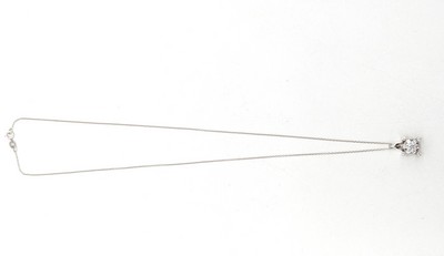 COLLIER avec pendentif en or gris (750) à chaton rond pavé de diamants retenu par quatre griffes diamantées, pour environ 0,85 ct au total.