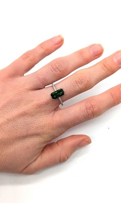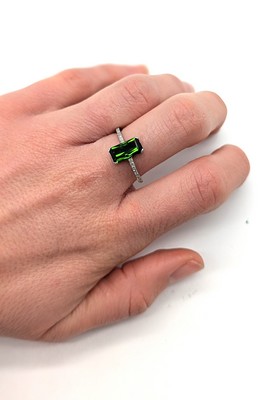 BAGUE en or (375) ornée d'une tourmaline verte rectangle de 1,8 ct, l'anneau entièrement serti de petits diamants.