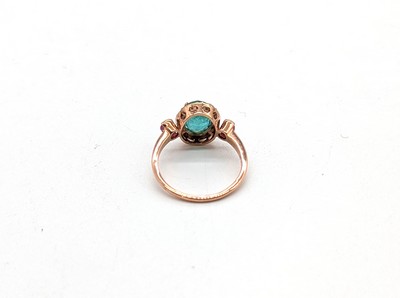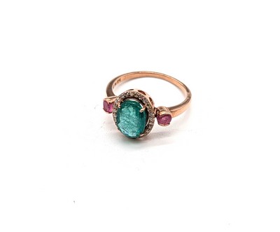 BAGUE en or (375) ornée d'une émeraude ovale de 1,8 ct environ dans un entourage de petits diamants et épaulée de deux rubis.