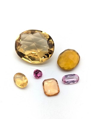 ENSEMBLE DE PIERRES FINES sur papier dont deux citrines (frottées) et trois pierres fabriquées.