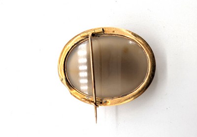 BROCHE CAMÉE en or (750) centrée d'un camée sur agate figurant le profil d'une femme à l'antique à la chevelure relevée par une couronne de lierre. Ligne d'émail noire en bordure.