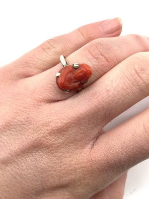 BAGUE en or gris (750) sertie d'un camée sur corail au profil d'une jeune femme de trois-quarts vêtue à l'Antique.