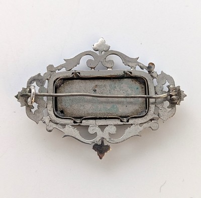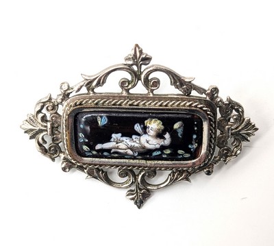 BROCHE en argent (?) à décor ajouré de rinceaux encadrant un cartouche émaillé figurant Cupidon chassant un papillon.