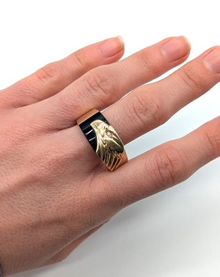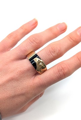 BAGUE D'HOMME en or (585) à décor d'une tête d'aigle (œil en diamant) et plaque d'onyx (petits chocs). TDD 73 ; Poids brut : 11,4 g