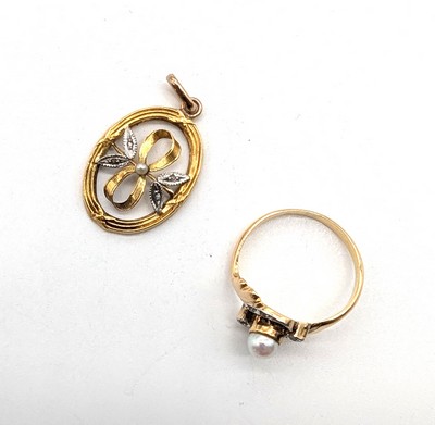 BAGUE et PENDENTIF Art Nouveau en or (750), perles et petits diamants taille rose (manques).