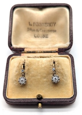 PAIRE DE DORMEUSES en or jaune et gris (750) serties de petits diamants taille ancienne. Ecrin.