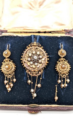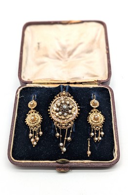 DEMI-PARURE NAPOLEON III en or (750), petites perles fines et diamants taille ancienne comprenant : une broche ronde en partie ajourée avec pampilles et une paire de pendants du même modèle.