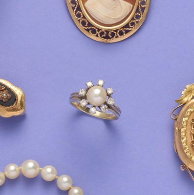 BAGUE fleur en or gris (750) avec perle de culture et petits diamants.
