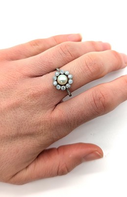BAGUE en or gris (750) centrée d'une demi-perle dans un entourage de diamants taille brillant.