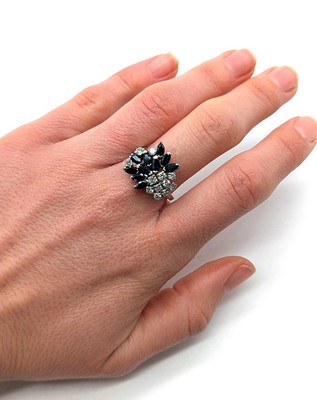 BAGUE en or gris (750) sertie de dix saphirs navettes et de douze petits diamants taille moderne.
