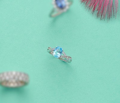 BAGUE en or gris (375) ornée d'une topaze taille ovale sur deux branches entrelacées dont l'une sertie de onze topazes blanches.
