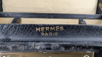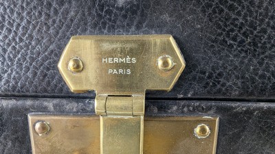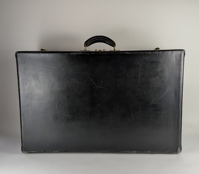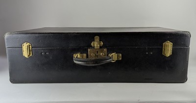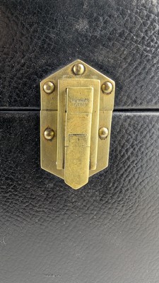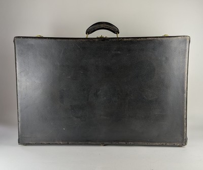 VALISE rectangulaire rigide gainée de cuir grainé noir, poignée porté en cuir et trois attaches en laiton signées, intérieur toilé beige à deux lanières de cuir noir. Vers 1950.