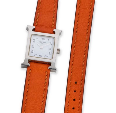 MONTRE bracelet de dame, modèle "Heure H" à boîtier en acier. Cadran signé à fond blanc avec index des heures en chiffres arabes. Mouvement à quartz. Bracelet d'origine double tour en cuir orange.