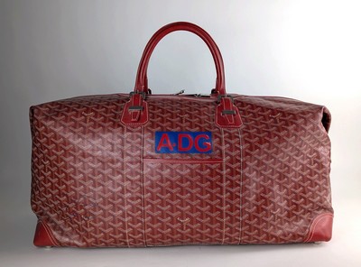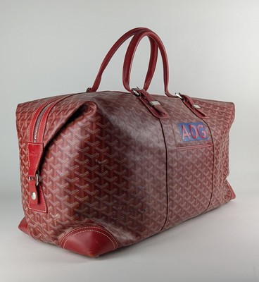 SAC de voyage Bowling, en goyardine et cuir rouges, avec chiffre A-DG, deux poignées, quincaillerie argentée, intérieur jaune. N° BAE020105.