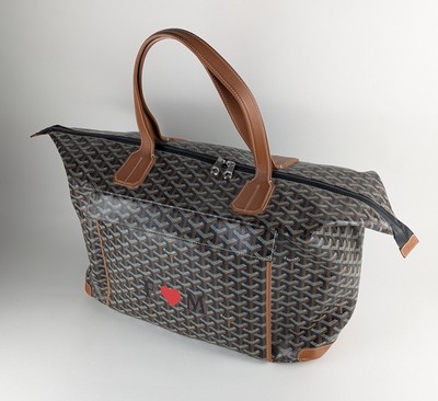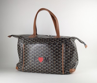 RARE SAC A PIQUE-NIQUE, en cuir marron et goyardine noire, monogrammé FM avec un coeur, deux anses porté épaule, intérieur isotherme, poche scratch en façade découvrant un nécessaire pour 4 personnes, avec couteau Opinel (manque un gobelet en plastique et possiblement un autre ustensile).