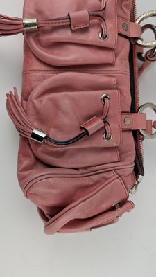 SAC A MAIN type bourse en cuir rose plissée, à quatre pochons appliqués avec liens à pompons, deux anses porté main, quincaillerie argent.