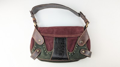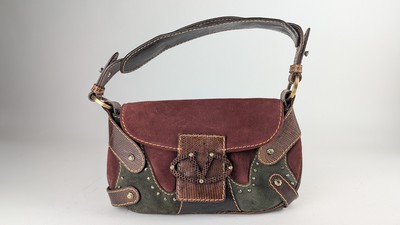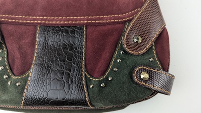 SAC A MAIN en nubuck bordeaux et vert et lanières effets lézard et crocodile, bandoulière, fermeture avec lanière central logoté.