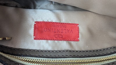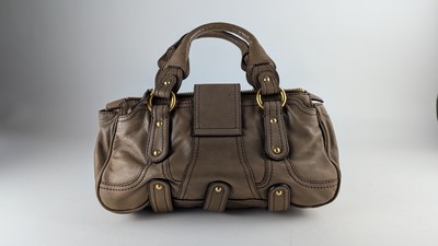 SAC A MAIN en cuir marron clair et quincaillerie dorée, rabat central logoté et fermeture zippée, à deux poignées, trois lanières à la base.