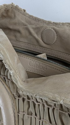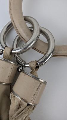 SAC A MAIN en cuir beige et nubuck plissé, à deux anses annulaires gainées cuir. Étiquette cuir n°SA 41-02-04-54. Dans un pochon de la marque.