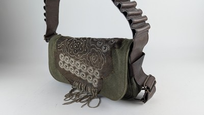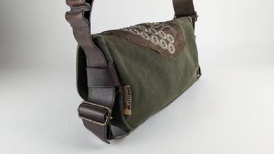 SAC A MAIN besace en toile verte et broderie sur fond marron formant rabat, bandoulière cartouchière en cuir marron.