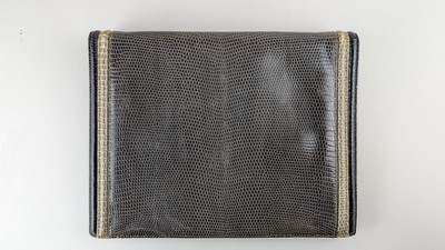 POCHETTE rectangulaire en lézard gris, à rabat à double filet beige et noir. Intérieur cuir gris et gris bleu.