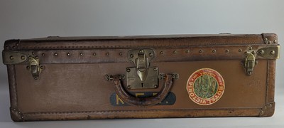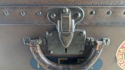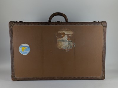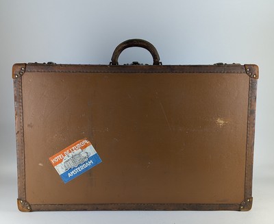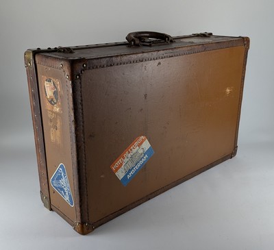 BELLE VALISE rectangulaire en cuir naturel et toile enduite marron avec chiffre K. C. R. et nombreux stickers de voyage, trois fermetures en laiton dont serrure centrale (sans clé), intérieur toilé beige avec étiquette orange (sans plateau).