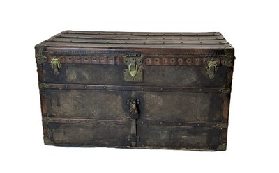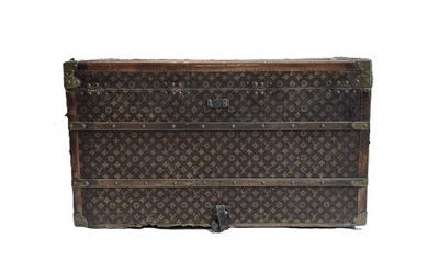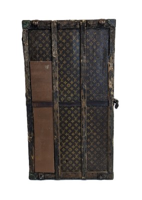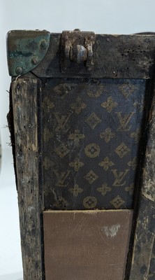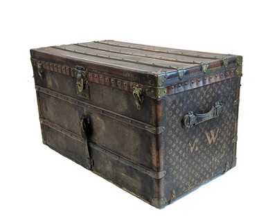MALLE DE VOYAGE en bois gainé de toile monogram et chiffrée MW sur les côtés. Renforts d'angles en fer. Serrure numérotée 062699 et marquée "1 rue Scribe, Paris, Louise Vuitton, London, 149 New Bond Street"