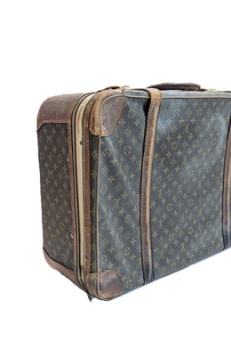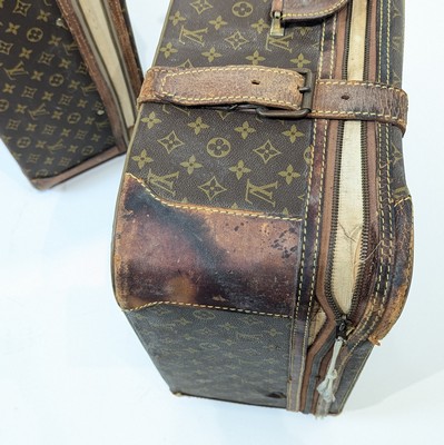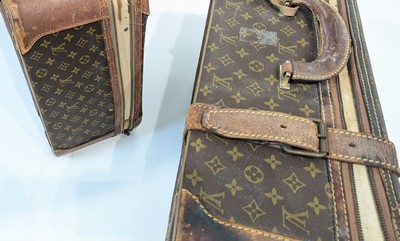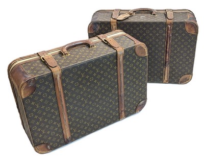 DEUX VALISES modèle Stratos en toile monogram et cuir naturel, poignée, fermeture à glissière à double curseur sous deux sangles ceinturées. Doublure en toile beige.