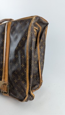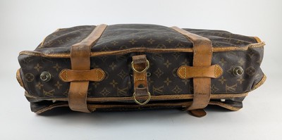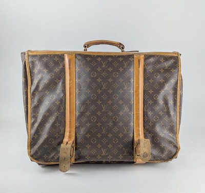 SAC PORTE-HABIT en cuir et toile enduite monogram, à deux lanières et une anse porté main, deux fermetures à zip, barre en bois et deux porte-manteaux signés, intérieur en tissus marron.