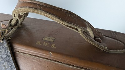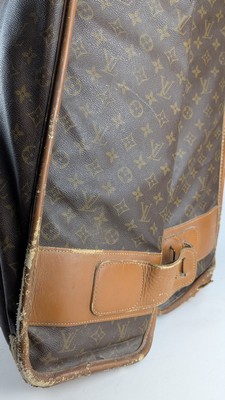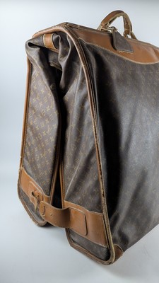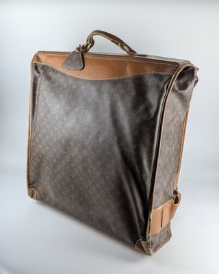 GRAND SAC PORTE-HABIT en cuir et toile enduite monogram. Une anse porté main, sangles d'attaches sur les côtés. Porte-étiquette en toile enduite monogram. Chiffré B. W. S. avec petite étiquette métallique MYERS Luggage - The Palm Beaches.