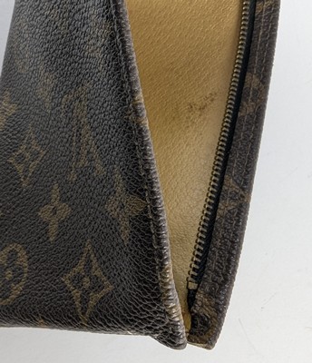 POCHETTE en vuittonite de forme trapèze, fermeture zippée, avec écusson cuir marqué.