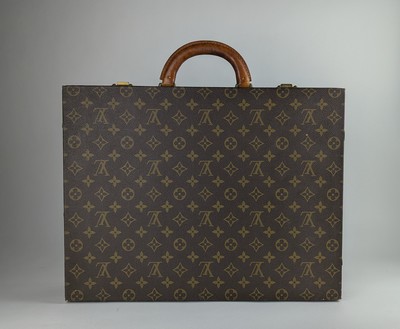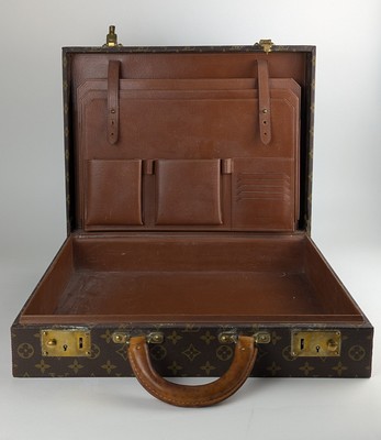 MALETTE modèle Président en toile monogram enduite marron et cuir naturel, à une poignée, deux fermetures à serrures (sans clé), intérieur aménagé "classeur" en cuir grainé brun à trois grands soufflets et trois petits compartiments, estampé de la marque sous le porte-carte.