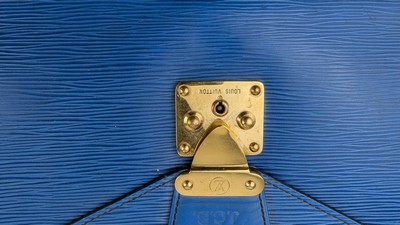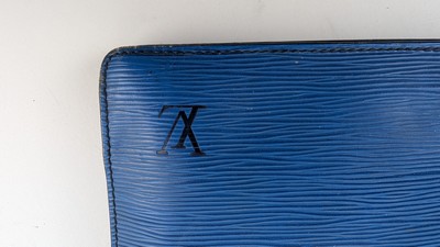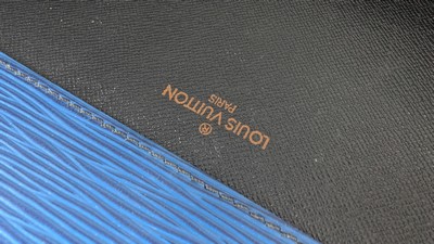 PORTE-DOCUMENT en cuir épi bleu, chiffré J. C. B. sur la languette, fermoir en métal doré, intérieur en toile noire.