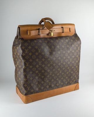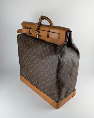 STREAMER BAG en cuir et toile enduite monogram. Fermetures à sangle sur rabat, avec poignée. Signé sur les côtés du rabat. Avec porte-étiquette, cadenas et sa clé de la marque.