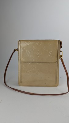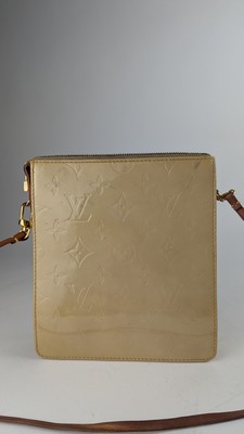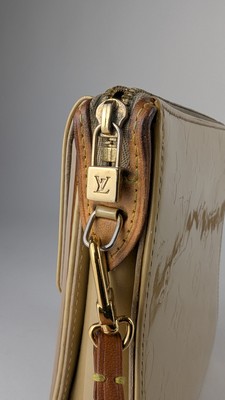 SAC A MAIN, modèle Mott en cuir verni, monogramme beige et cuir naturel, avec une anse amovible, bijouterie en métal doré.
