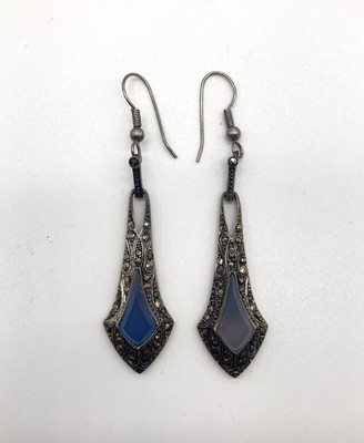 PAIRE DE PENDANTS D'OREILLE en argent et marcassite, avec pierre bleue.