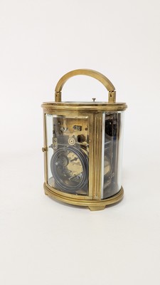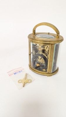 PENDULETTE-REVEIL DE VOYAGE en laiton doré de forme ovale, vitrée toutes faces. Le cadran émaillé à chiffres romains avec compteur des mois dans un cadran indépendant. Deux sonneries réglables.
