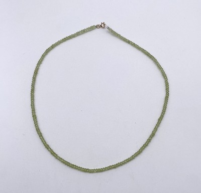 FIN COLLIER de petites billes de péridots facettées. Fermoir en plaqué or.