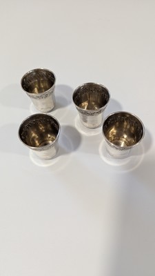 QUATRE GOBELETS A LIQUEUR en argent (950) ciselé et repoussé à décor de frise stylisée.